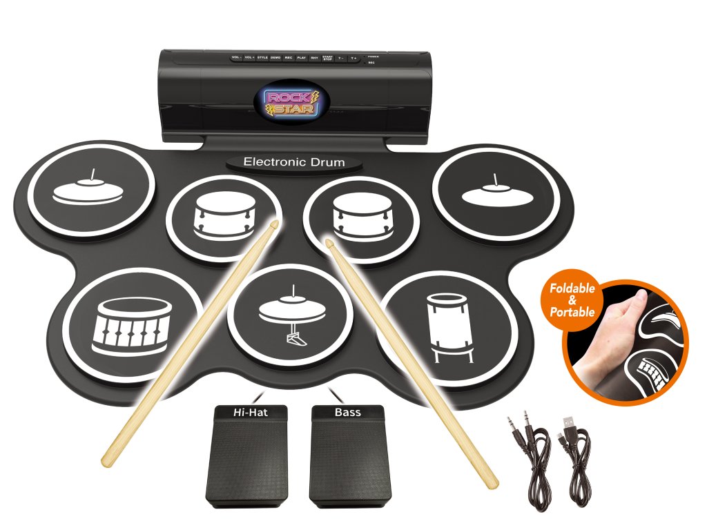 Elektronická bicia súprava s 2 pedále. Rozmery 44x32x6 cm. Svetelné a zvukové efekty. 3xAA batérie súčasťou. Obsahuje 7 elektronických bubnov, 2 chodidlové pedále (hit-hat, bass), 2 drevené paličky, kábel na pripojenie mobilu/mp3 prehrávača, USB kábel, návod. Funkcia - 7 realistických zvukov bubnov (pop, rock, latin, electro, percussion), 12 demo skladieb (funk, latin, dance, samba, cha-cha, swing hi-hat, upbeat rock, heavy rock), 9 rytmov, nahrávanie (až 1000 úderov) a prehrávanie, nastavenie tempa a hlasitosti, konektor na pripojenie mobilu/mp3 prehrávača.Dodatočné parametre