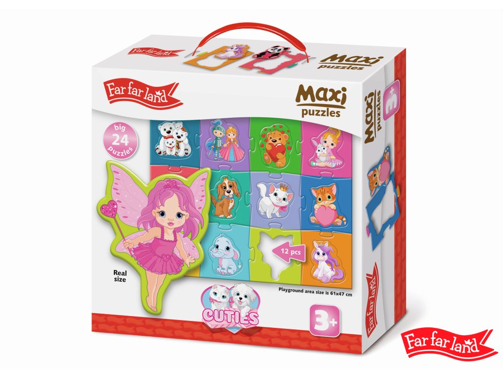 Far Far Land Maxi Puzzle roztomilé postavičky. Balenie obsahuje 24 dielikov (12 puzzle dielikov + 12 dielikov s postavičkami). Zložené 61x47 cm.Dodatočné parametre