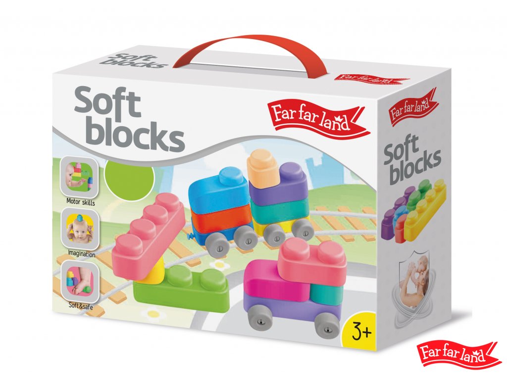 Far Far Land Stavebnica mäkká. Všetky bloky sú vyrobené z mäkkého bezpečného materiálu. Balenie obsahuje 15 blokov a 12 koliesok.Dodatočné parametre