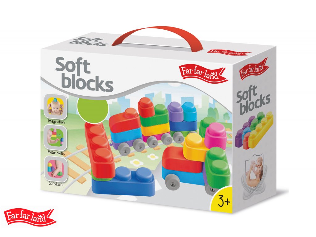 Far Far Land Stavebnica mäkká. Všetky bloky sú vyrobené z mäkkého bezpečného materiálu. Balenie obsahuje 21 blokov a 16 koliesok.Dodatočné parametre