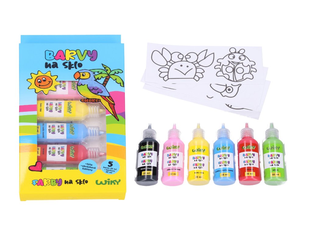 Farby na sklo 5 +1 22 ml Obsahuje: 4 farby (ružová, žltá, svetlo modrá, červená, zelená) 22 ml + kontúra čierna 22 ml + 2 fólie + obrázkové šablóny.Dodatočné parametre