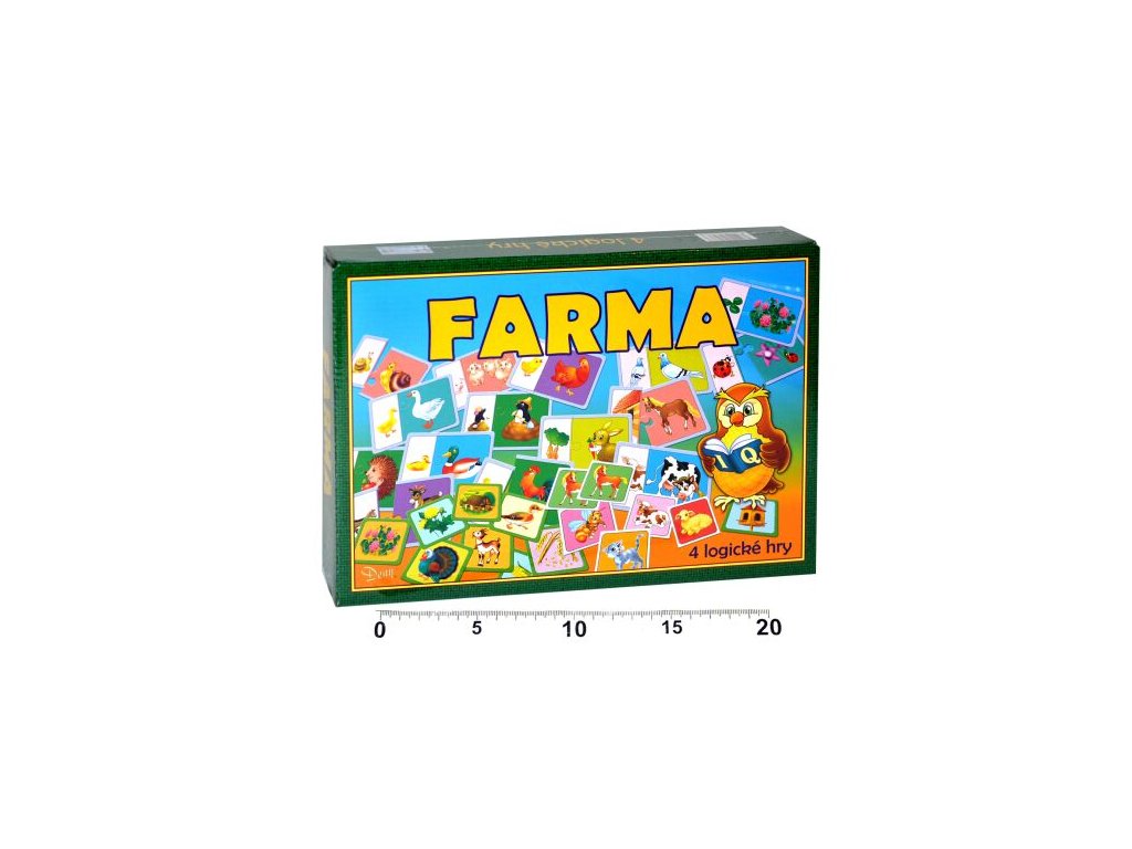 Súbor náučných, logických spoločenských hier FARMA obsahuje súčasti pre štyri hry. Sú určené pre deti vo veku od 4 rokov. Pomocou týchto hier získajú deti veselým a hravým spôsobom nové poznatky o rastlinách a zvieratkách žijúcich na farme. Hry rozšíria deťom vedomosti o prírode a zlepšia im logické myslenie. Príslušenstvo: 106 ks obrázkových kartónových kariet pexeso návod k hrám