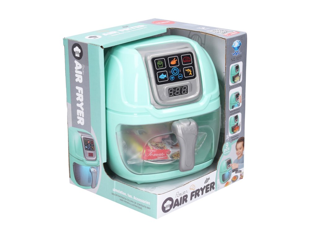 Fritéza teplovzdušná s efektmi. Rozmery 17x16,5x19 cm. Svetelné aj zvukové efekty. Po zatvorení sa rozsvieti svetlo a displej. Tlačidlami je možné zvoliť dobu vyprážania. Po zapnutí sa rozsvieti modré svetlo. Potraviny vo fritéze zmení pri vyprážaní farbu. Obsahuje: fritézu, 2 nugety, 3 hranolky, krabičku cestovín, 2x tanierik a klieštiky. 3xAA batérie súčasťou.Dodatočné parametre