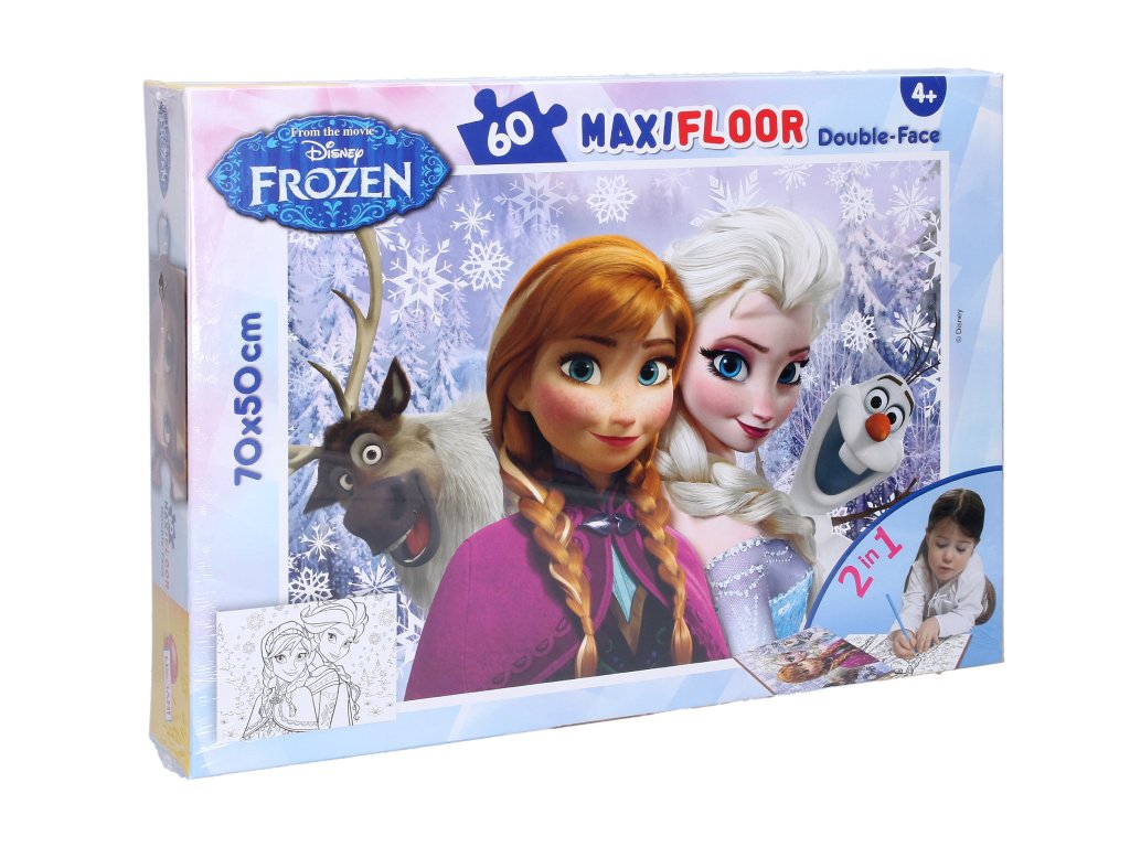 Lisciani Frozen Puzzle MaxiFloor 60 obojstranné 2v1. Obojstranné puzzle, 60 dielikov. Rozmery 70 x 50 cm. Obrázok Elsa a Anna. Predná strana s farebným obrázkom, na zadnej strane predkreslený na vymaľovanie.Dodatočné parametre