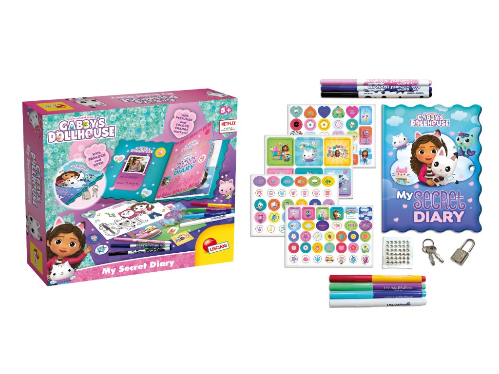 Gábinin kúzelný domček Tajný denníček. Tajný denníček na zámok, s dekoráciami a kresliacimi potrebami. Obsah balenia - denníček, zámok a kľúč, samolepky, farebné fixky s vôňou, perá meniace farbu, dekoratívne kamienky, návod.Dodatočné parametre