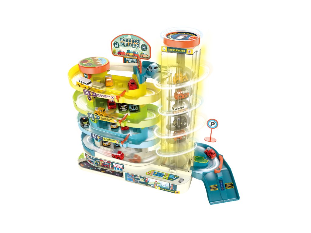Garáž poschodová s výťahom 6 áut. Rozmery 30x13x34 cm. Svetelné a zvukové efekty. 3xAA batérie nie sú súčasťou. Prevádzka výťahu na batérie či manuálne (prepínač). Obrázkový návod na zloženie na zadnej strane obalu.Dodatočné parametre