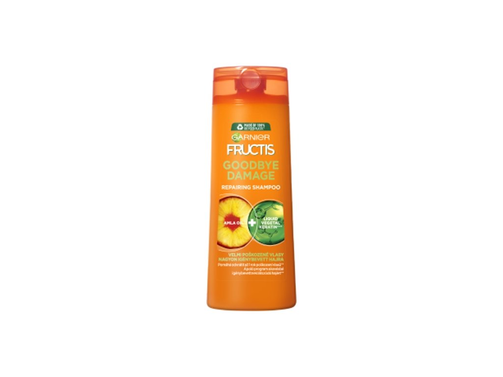 Šampón Fructis Goodbye Damage, špeciálne navrhnutý pre poškodené vlasy, spája vo svojom zložení výťažky z oleja amla a kéraphyll na obnovu povrchu vlasu a vyplnenie trhliniek spôsobených vonkajšími agresívnymi vplyvmi.