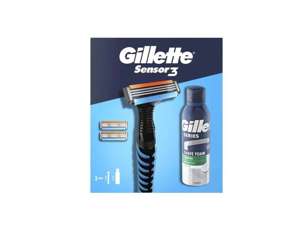 Gillette Sensor3 darčeková sada: holiaci strojček a tri náplne, upokojujúca pena na holenie, 200 ml