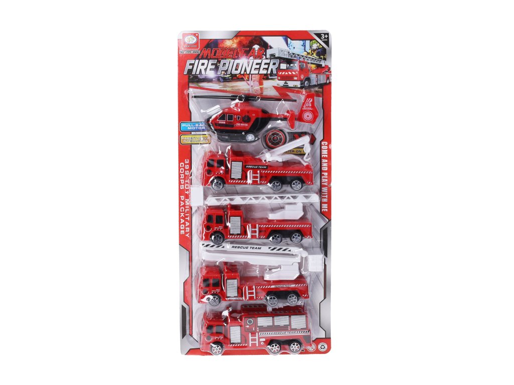 Hasičský set. Na spätné natiahnutie a voľné kolesá. Súčasťou vrtuľník, 4 autá. Veľkosť auta 17 cm.Dodatočné parametre