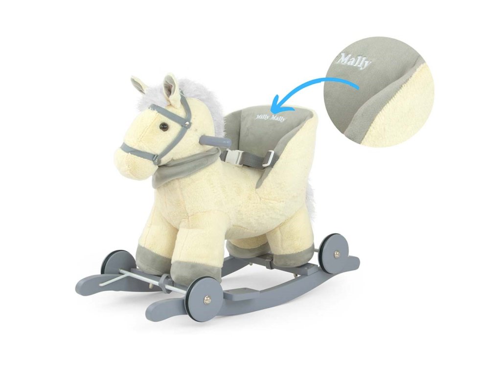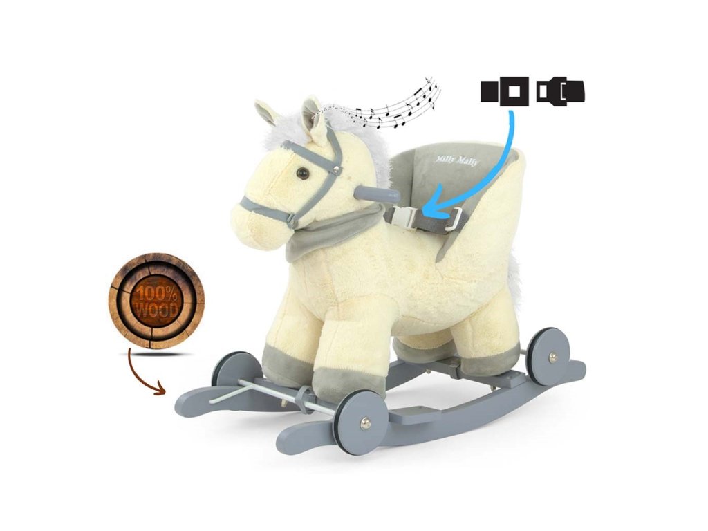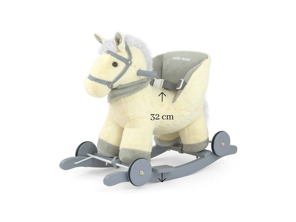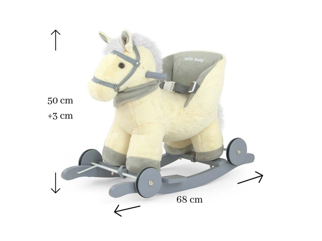 Mäkučký hojdací koník Polly bol navrhnutý pre najmladšie deti, pre ktoré sú tradičné hojdacie kone príliš veľké. Pohodlné a tvarované sedadlo v tvare kresla a nastaviteľné popruhy poskytujú pohodlie a bezpečnosť počas bezstarostného hojdania vášho dieťaťa. Opierky na nohy na lištách a rukoväti ešte viac pomáhajú udržať rovnováhu. Preklopením jednoduchého mechanizmu na lištách vysuniete kolieska, čím v sekunde zmeníte hojdaciu hračku na jazdiaceho koníka. Hojdacie lišty je možné jednoducho odskrutkovať. Po stlačení uška koník veselo zarechtá, po stlačení druhého vydá zvuk klusajúceho koňa. Batérie sa vkladajú do púdra umiestneného na brušku.Charakteristika: