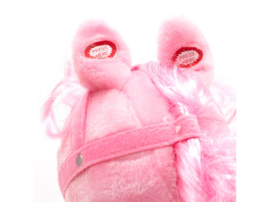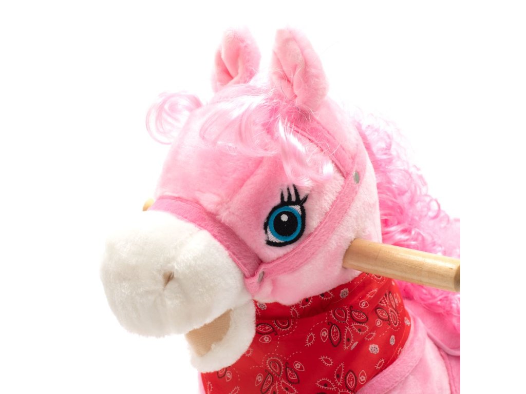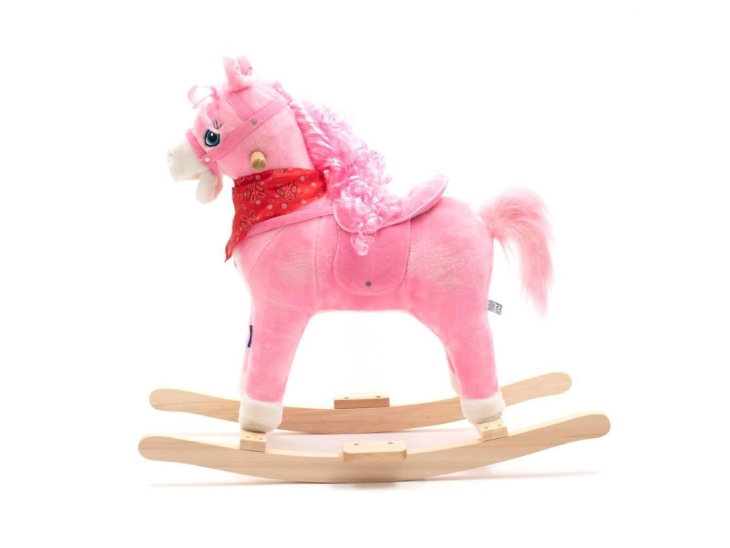 Neobyčajne krásny hojdací koník s červenou šatkou na krku. Po stlačení ušiek koník zavrtí chvostíkom, otvára ústa, vydáva zvuky klusajúceho koňa alebo spieva pesničku. Pohodlné sedlo, pevná uzda, drevené rukoväte alebo kovové strmene zaistia vašim kovbojom ešte väčšiu stabilitu a komfort počas hojdania. Je vyrobený z mäkkého plyšového materiálu, pevné drevené lišty alebo rukoväte je možné ľahko odskrutkovať. Batérie sa vkladajú do puzdra umiestneného na brušku koníka.
