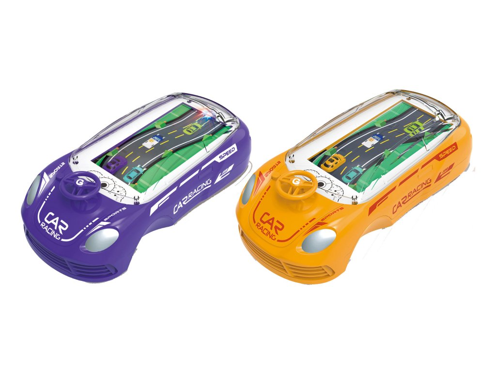 Hra závodné auto fialová. Rozmery 17x8x5 cm. Svetelné a zvukové efekty. 3xAAA batérie nie sú súčasťou. Ovládanie volantom. Aktivácia tlačidlom vľavo od volantu. Cieľom hry je vyhýbať sa autám na ceste.Dodatočné parametre