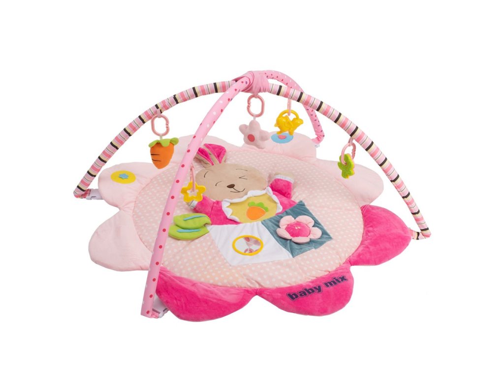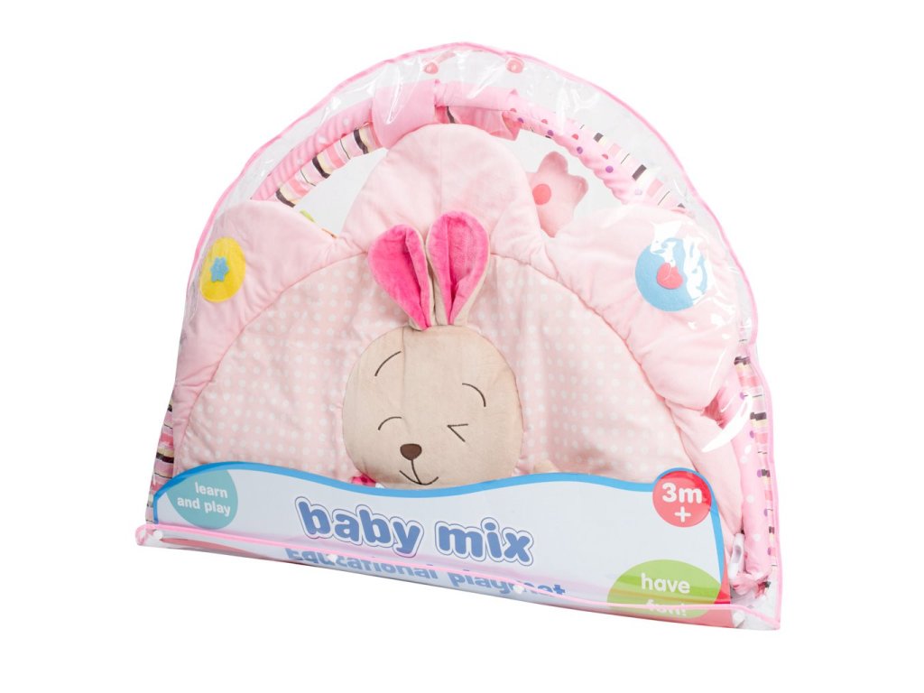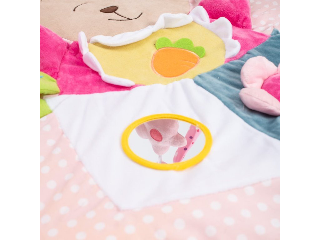 Krásna originálna vzdelávacia hracia deka Baby Mix s hrazdou rozvíja detskú predstavivosť vďaka poznávaniu farieb a tvarov. Hracia deka v krásnej žiarivej farbe s motívom zajačika. Rozvíja zmysly hmatu, zraku aj sluchu vďaka šuštiacim a pohyblivým častiam. Príjemný a mäkký materiál umožňuje pohodlné ležanie na brušku alebo chrbte a umožňuje slobodu pohybu Vášho dieťaťa. Bábätko tak môže získať bezpečný útulnejší priestor a motivuje k zdvíhaniu dieťatka. Hračky je možné z hrazdičky ľahko zložiť. Každé bábätko si na deke nájde svoju obľúbenú hračku. Patrí tu zrkadlo, sušiace časti, plyšová hračka s pískatkom, plyšová hračka s rolničkou. Vďaka jednoduchej konštrukcii a dodávanej taške je možné deku ľahko prenášať. Hračky je možné odopnúť a používať samostatne. Kúpte Vášmu bábätku rozprávkové miesto na hranie i odpočinok. Nadýchaná jemnučká a semišková hracia deka poskytne bábätku dokonalý komfort. Pokiaľ deku práve nepoužívate, ľahko ju zložíte a uchováte tak pred prachom alebo prípadným poškodením. Deku rozložíte späť počas minútky. Vhodné pre deti od 3 mesiacov. Rozmery: cca 87 cm. Výška: cca 41 cm.