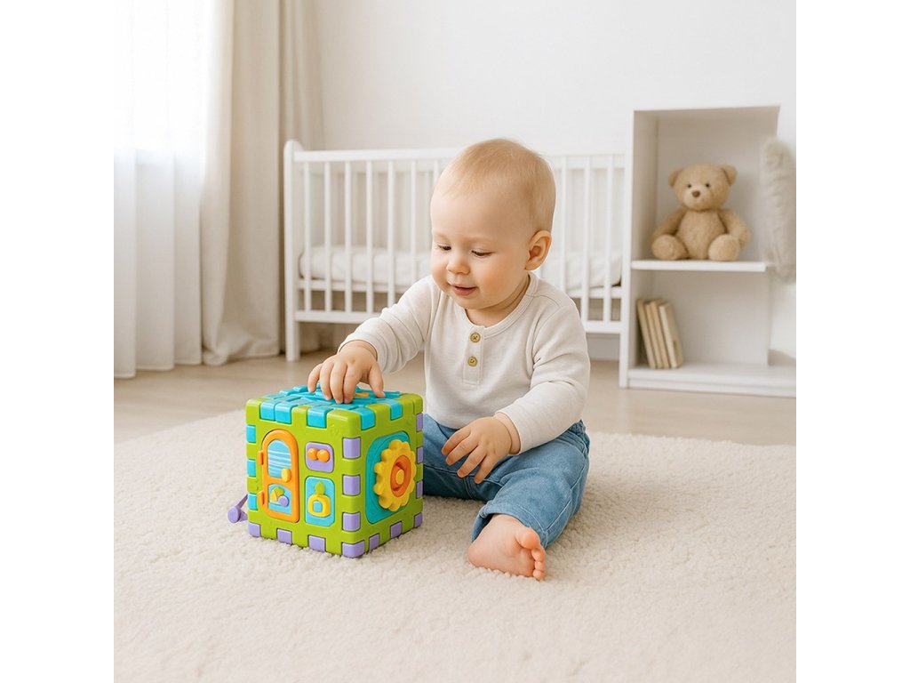 Detská interaktívna hudobná kocka Baby Mix. Kocka stimuluje koordináciu a rozvoj zmyslov a precvičuje jemnú motoriku vášho dieťaťa. Obsahuje labyrint s guličkami, sústavu otáčajúcich sa ozubených koliesok, 4 rôzne farebné tvary ktoré dieťa môže vkladať, otáčací telefón, vďaka ktorému sa dieťa môže naučiť čísla a farby a volant. Kocka ďalej obsahuje hrajúce piánko, ktoré vydáva zvuky, a odomykateľné dvere s kľúčom a zrkadlom. Určené pre deti od 18 mesiacov. Rozmery cca 17x17x17 cm. Batérie 3x 1,5V batérie typu AAA nie sú súčasťou balenia.