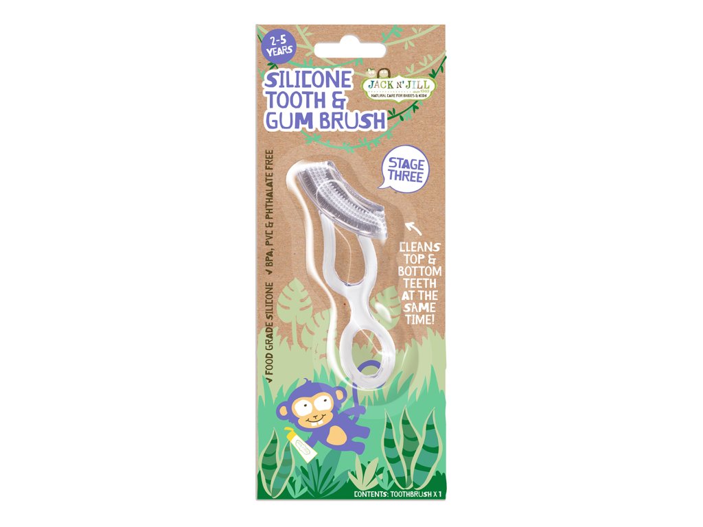 Jemný k malým zúbkom a citlivým ďasnám, vďaka jemným silikónovým vláknam. Obojstranná kefka na zuby a ďasná čistí súčasne hornú aj spodnú časť a zároveň aj prednú aj zadnú časť ústnej dutiny! Vieme, že táto kefka na zuby vyzerá zvláštne, ale naozaj funguje. Pretože „objíma“ zuby, deti ho môžu používať jednoducho samé. Návod na použitie: Pred použitím a po ňom kefku dôkladne umyte. Naneste naň malé množstvo prírodnej zubnej pasty Jack N' Jill. Jemne kĺzajte kefkou po zuboch pomocou pohybov dopredu a dozadu. Kefku odporúčame vymeniť každé 1–3 mesiace alebo častejšie, prípadne po chorobe. Vhodný pre deti od 2-5 rokov.