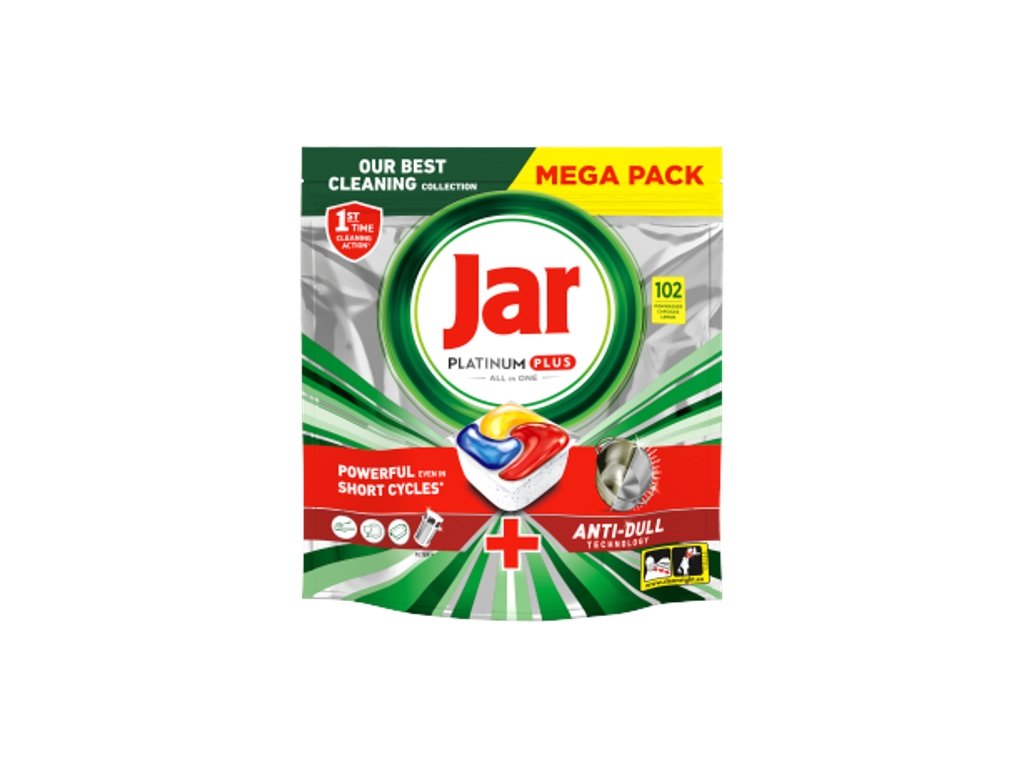 Jar kapsule do umývačky Platinum Plus All in One Lemon zanechávajú riad čistý ako nový a majú najlepšie čistiace účinky. Dokonca pomáhajú odstraňovať zašedlosť vznikajúce časom a obnovujú pôvodný lesk riadu. Kapsule do umývačky poskytujú vynikajúcu čistotu a odstraňujú odolné škvrny od jedla aj v podmienkach krátkeho cyklu. Prepnite na krátky režim. Jar v sebe zlučuje tekutý aj práškový čistiaci prostriedok v jednej účinnej kapsule. Kapsule obsahujú soľ a prostriedok na oplachovanie s ochrannou funkciou pre sklo a striebro. Vysoko rozpustný obal sa rýchlo rozpúšťa a funguje dobre aj pri krátkych cykloch, pretože riad sa začína ihneď umývať. A navyše sa kapsule tak ľahko používajú! Prepnite na krátky cyklus a ušetrite oproti bežnému štandardnému cyklu čas, energiu a vodu vďaka kapsulám do umývačky od značky Jar.