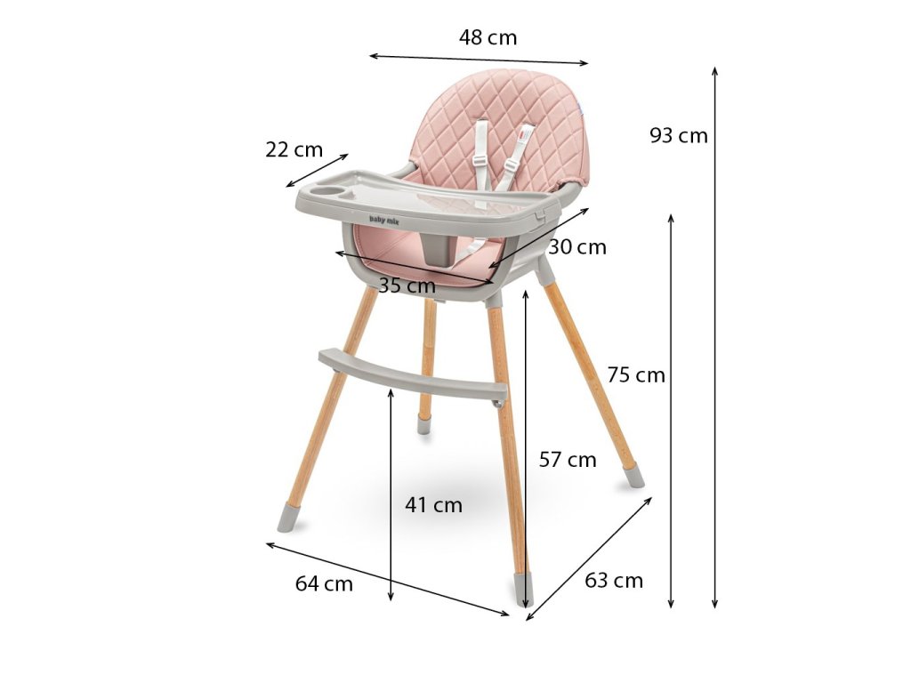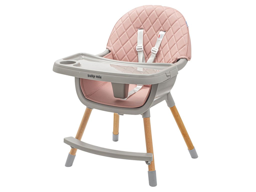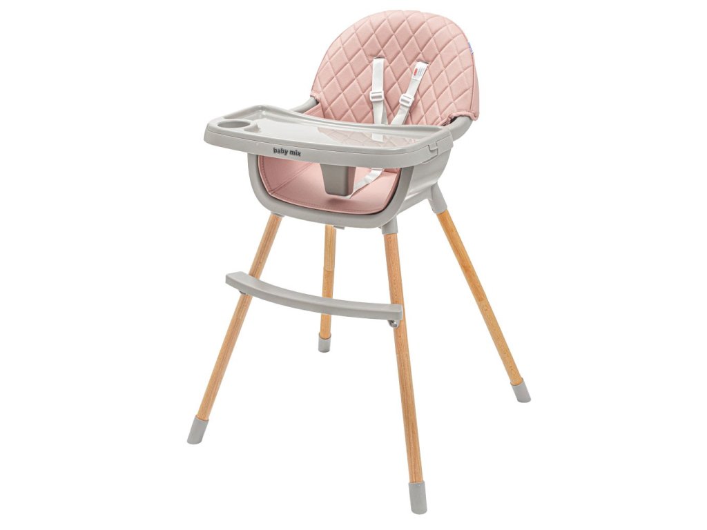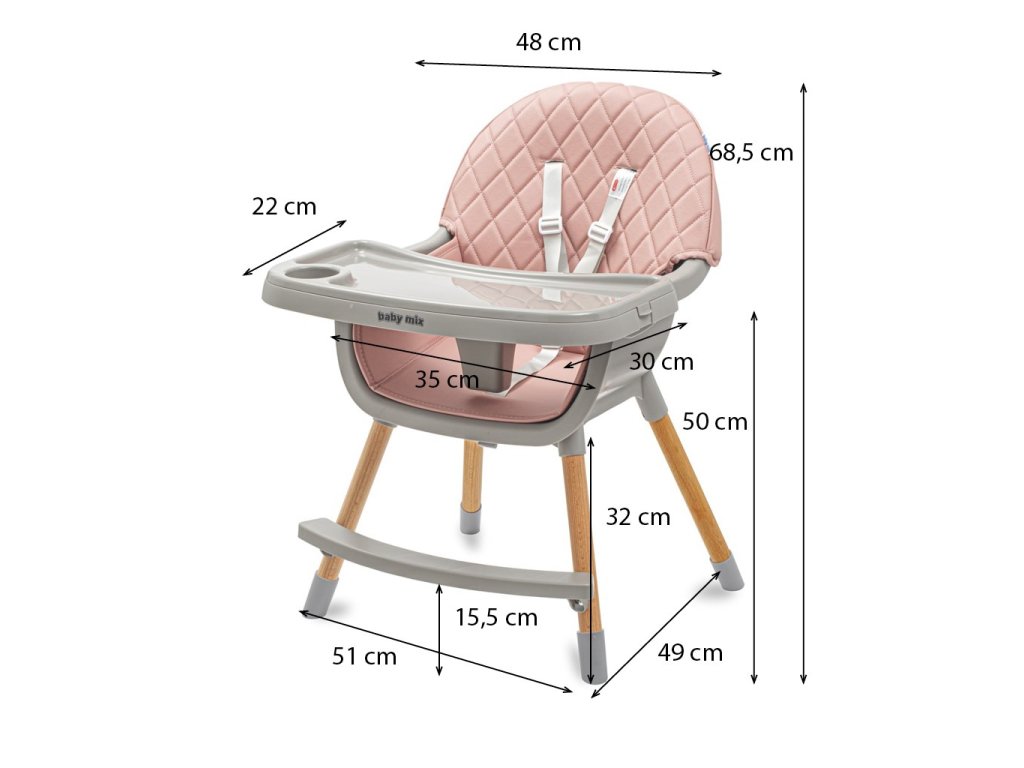 Jedálenská stolička Baby Mix má všetky funkcie, ktoré uľahčujú každodenné kŕmenie: nastaviteľná dvojitá tácka, 5bodové pásy, odnímateľné čalúnenie z eko kože, opierka nôh, látkový kôš, protišmykové nožičky. Stoličku je možné ľahko premeniť na nízku stoličku odstránením spodnej časti nôh. Jedálenská stolička Baby Mix je vhodná pre deti vo veku 6-36 mesiacov.