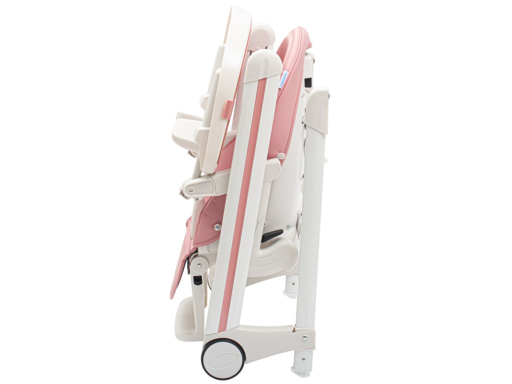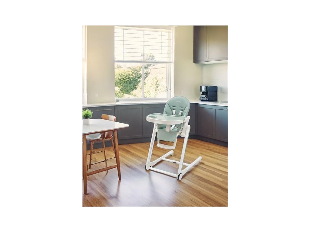 -Jedálenská stolička je vybavená dvoma brzdenými kolieskami a dvoma gumovými nožičkami.