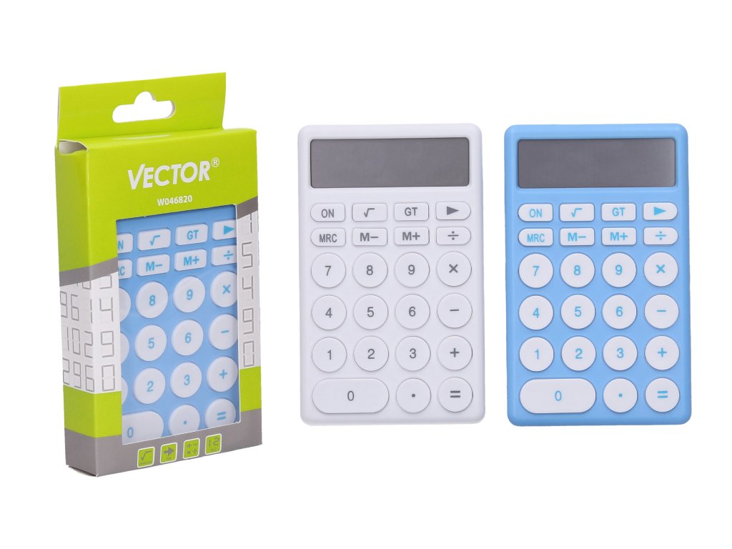 Kalkulačka simple VECTOR. Rozmer kalkulačky: 8,5 x 13,5 cm. Súčasťou boxu 1 x AAA batérie. 2 farebné prevedenie: biela, modrá.Dodatočné parametre