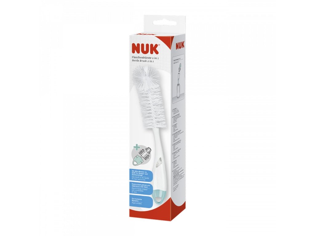 Praktická väčšia kefa na fľaše NUK. Vrchná časť rúčky je rozkladateľná a obsahuje menšiu kefu na čistenie cumlíkov. Charakteristika:- pevné štetiny a pružná kefa