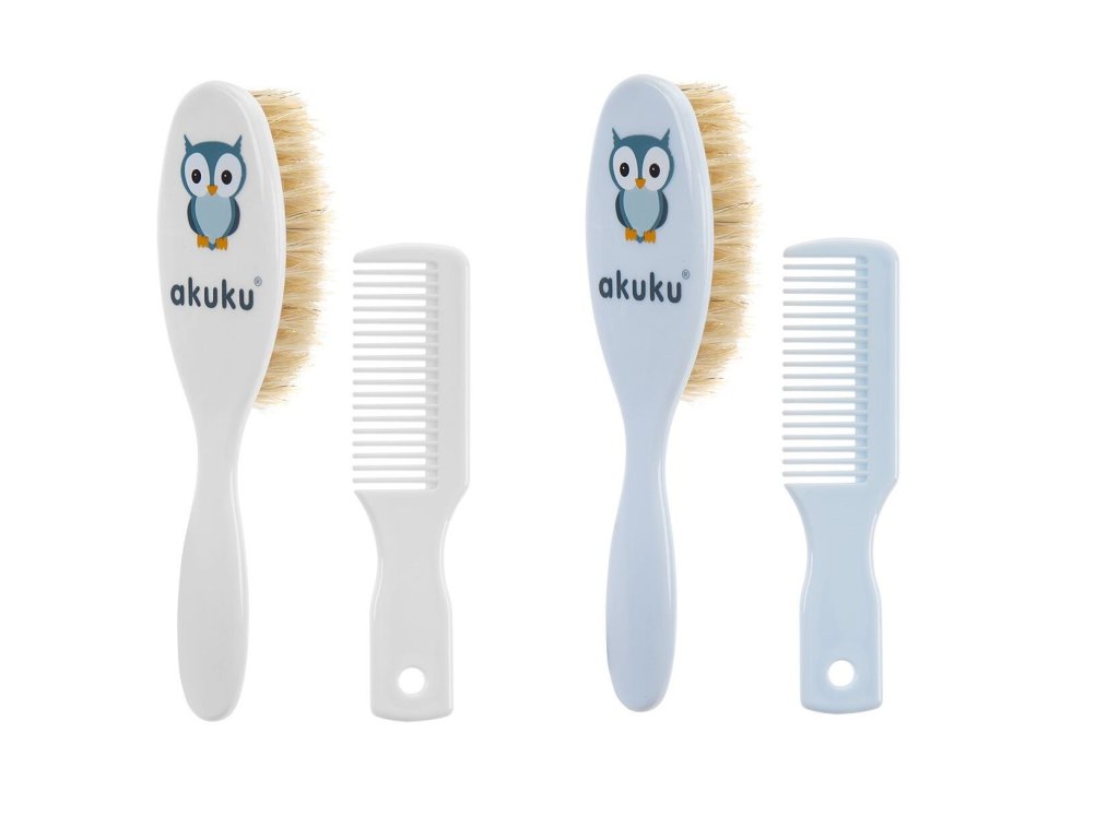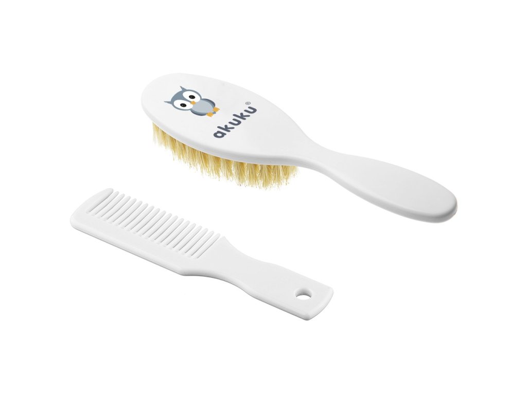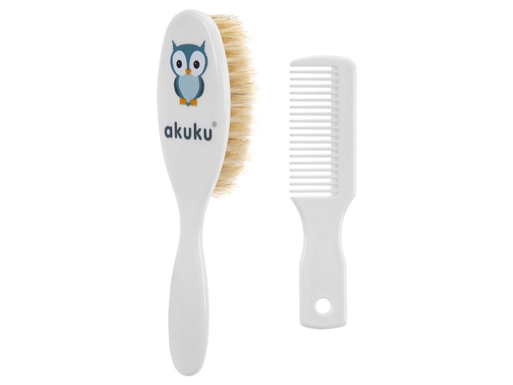 Kefka a hrebienok s prírodným vlasom Akuku. Vyrobené bez BPA. Rozmery: hrebienok: cca 11 cm, kefka: cca 15 cm. Vhodné pre deti od narodenia.Dodatočné parametre