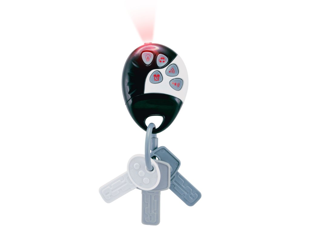 Kľúče s efektmi. Veľkosť 17 cm. Svetelné a zvukové efekty tlačidlami na kľúčenke. Tlačidlo s obrázkom žiarovky - svetlo, ostatné tlačidlá - zvuky. 2xAAA batérie súčasťou.Dodatočné parametre