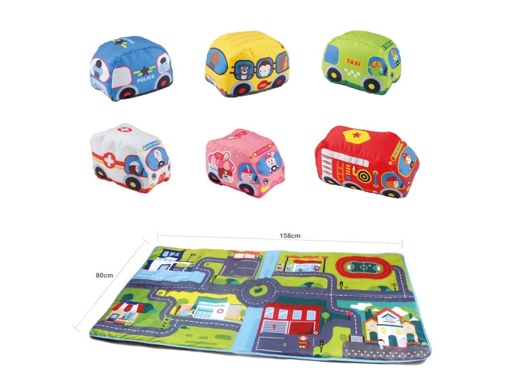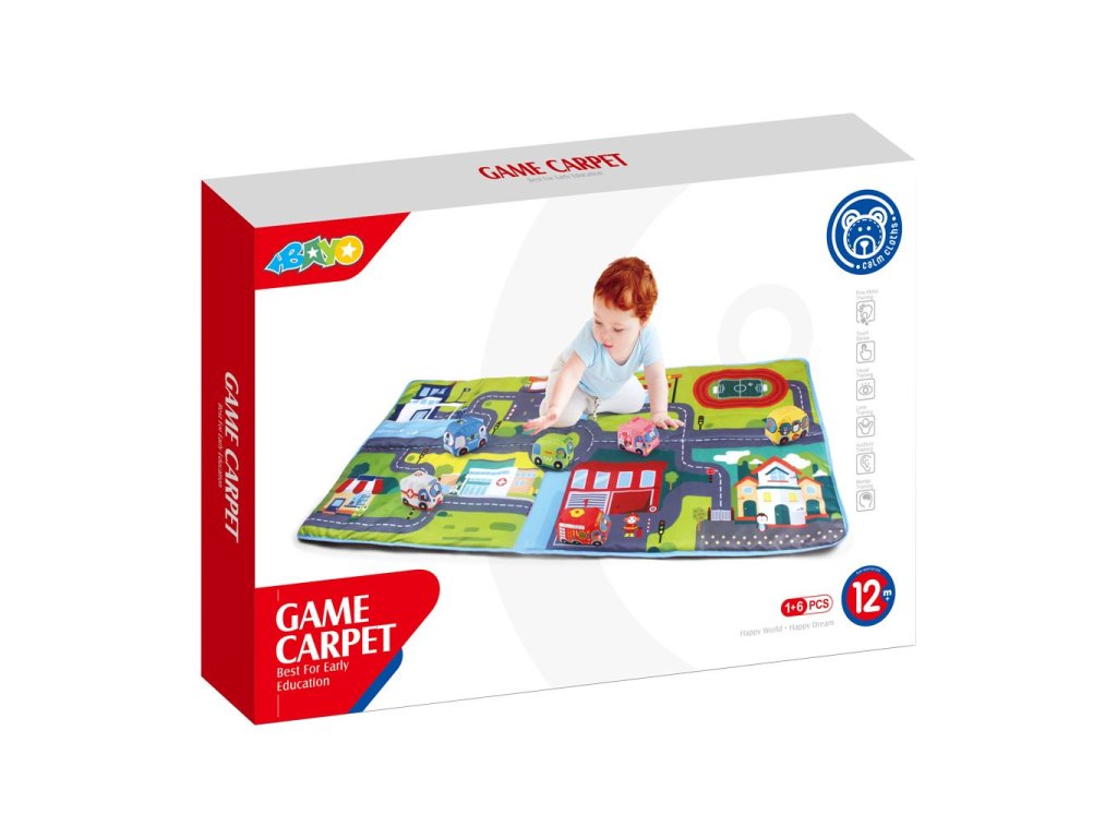 Koberček na hranie Bayo je nádherný koberček s motívom mesta s nádherne vykreslenými cestami, semaformi, kruhovým objazdom a budovami. Koberček dopĺňa 6 mäkkých vankúšikových autíčok - požiarnici polícia, autobus, .... Je vhodný pre deti od 12 mesiacov. Koberček chráni od chladnej podlahy a má rozmery 80x158 cm.