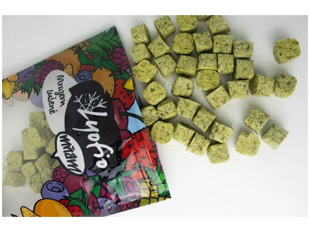 Kokosové mlieko, mango a špenát k sebe neodmysliteľne patria v smoothie, ale ak sa vám nechce lúpať a krájať ovocie, dajte tejto trojke šancu aj v lyofilizovaných kockách. Najskôr zábavne chrumknú a potom sa v ústach úplne rozplynú.