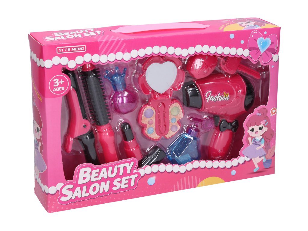 Kozmetický set s fénom. Veľkosť fénu 13cm. Obsahuje: fén, kulmu, okrúhlu kefu na vlasy, zrkadlo, kľúče od auta, flakónky, rúž. 1xAA batéria nie je súčasťou.Dodatočné parametre