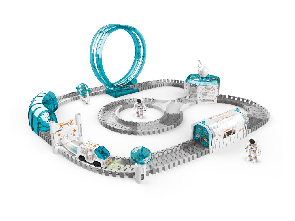 Kozmická dráha veľká. Rozmery 85x75x32 cm. Súčasťou auto, kozmonaut, funkčný projektor. Svetelné efekty. 2xAAA batérie do auta nie sú súčasťou, 3xAG13 do projektora súčasťou. Prepínač ON/OFF na spodnej strane auta a na projektore. Obrázkový návod na zostavenie na obale. Dráhu je možné zostaviť do rôznych tvarov podľa obrázkov na obale.Dodatočné parametre