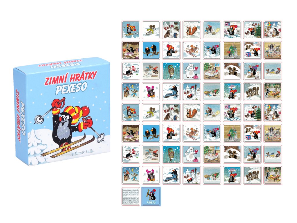 Krtko Pexeso v krabičke zimné hrátky. 64 kartičiek, 32 párov. Rozmer kartičiek 63x63mm. Papier 350g.Dodatočné parametre