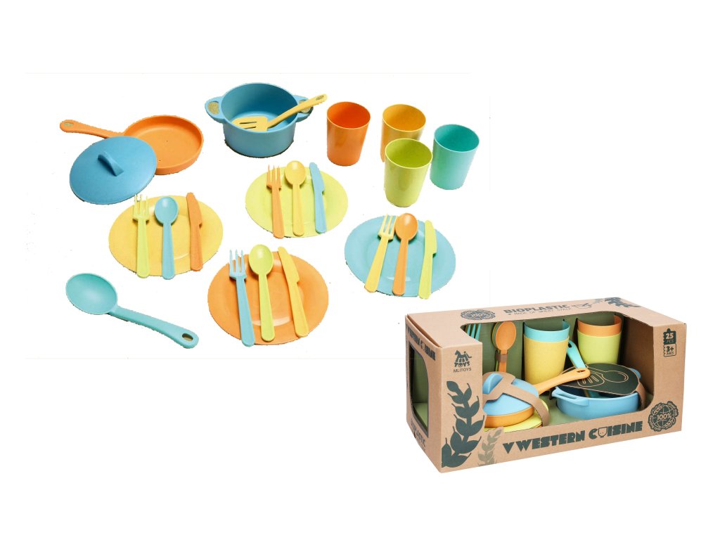 Kuchynský riad Bioplastic. Panvička s pokrievkou, hrniec, 4 taniere, 4 poháre, 2 naberačky, 4 nože, 4 vidličky, 4 lyžice.Dodatočné parametre