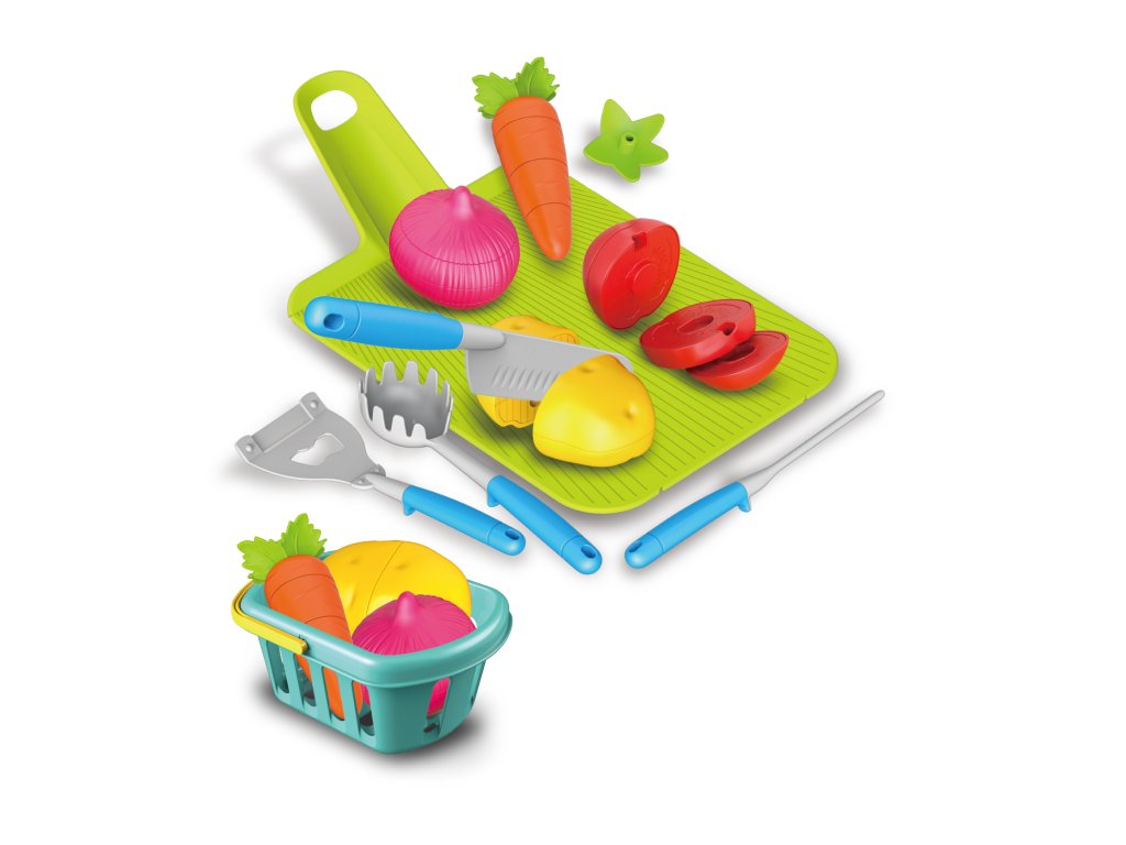 Kuchynský set na krájanie. Doska na krájanie, košík, rozkrojiteľná mrkva, paradajka, zemiaky, cibuľa, nôž, škrabka, napichovátko, naberačka.Dodatočné parametre