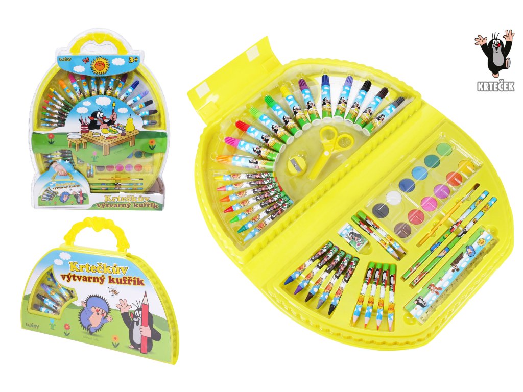 Kufrík výtvarných potrieb 50 ks Krtko. Obsahuje: 12 fixiek, 12 voskových pastelov, 6 pasteliek, 12 vodových farieb, 1 pravítko, 2 ceruzky, 1 štetec, 1 guma, 1 strúhatko, 1 nožnice.Dodatočné parametre