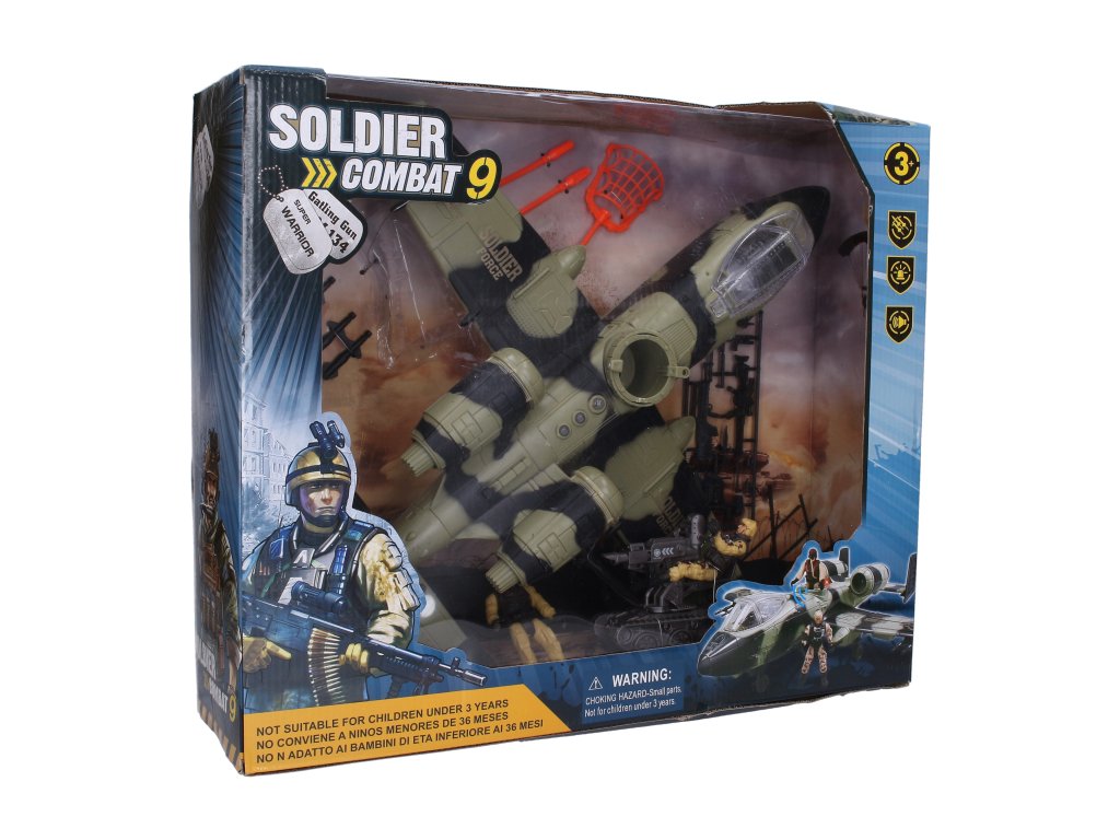Lietadlo s figúrkami a efektmi. Vozidlo strieľajúce náboje a sieť. Veľkosť lietadla 48 cm, vojakov 10 cm. Svetelné a zvukové efekty tlačidlami na trupe pred motormi lietadla. 2xAA batérie do lietadla nie sú súčasťou. Obsah - lietadlo, vozidlo, náboje, zbrane, 2 figúrky vojakov. Obrázkový návod na používanie na zadnej strane obalu.Dodatočné parametre
