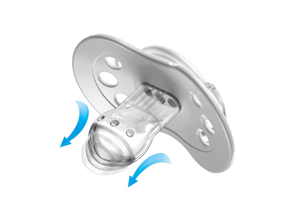 Tvarovaný vykrojený tvar štítku umožňuje dieťaťu voľne dýchať nosom. Je vyrobený z bezpečného materiálu, ktorý neobsahuje BPA Jedinečný okraj štítku je vyrobený zo zdravotníckeho materiálu, je príjemný na dotyk a zabraňuje otlačeniu cumlíka.
