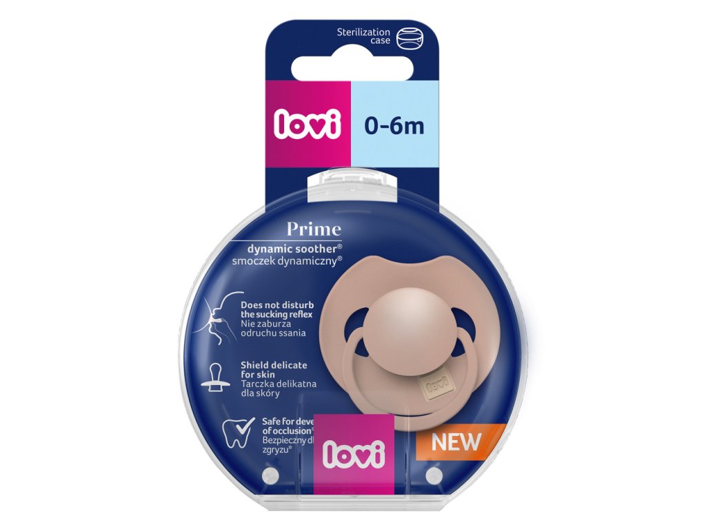 Dynamický cumlík LOVI z kolekcie PRIME je bezpečný pre sací reflex a nenarúša vývoj reči a zhryzu.* Dynamický cumlík sa vďaka unikátnej konštrukcii zo silikónu rôznej hrúbky naťahuje a sťahuje podľa rytmu sania dieťaťa. Vďaka tomu chráni jeho sací reflex a nemá nepriaznivý vplyv na dojčenie. Symetrický tvar špičky vychádza z tvaru bradavky naplnenej mliekom, ktorá poskytuje bábätku známy pocit podobný pocitu z prsníka. Štítok cumlíka je špeciálne vytvarovaný pre uľahčenie dýchania nosom a prehĺtaní slín, rovnako ako pri prsiach. Tvarovaný štítok čo najmenej priľne k pokožke dieťaťa, čo uľahčuje voľné prúdenie vzduchu a znižuje tak riziko podráždenia pokožky. Dynamický cumlík LOVI PRIME navyše nenarúša vývoj reči a hryzenia*. Špička je sploštená a krk je tak tenký, že umožňuje dieťaťu voľne zatvárať ústa a správne pracovať ďasnami pri saní a poskytuje dostatok priestoru v ústach pre prácu jazyka, čo znižuje riziko maloklúzie a chýb reči*. Cumlík je ľahký, nezaťažuje detské ústa. Špička je vyrobená zo silikónu, takže sa pri používaní v ústach dieťaťa nedeformuje. ¬ Cumlík LOVI PRIME má atraktívny, módny dizajn - je perfektným doplnkom detskej výbavy, farby cumlíka sú v súlade s najnovšími trendmi. * za predpokladu dodržania ortodontických a neurologopedických odporúčaní. Vhodné pre deti od 0 do 6 mesiacov. a zhryzu dieťaťa**za predpokladu dodržania ortodontických a logopedických odporúčaníCHRÁNIA SACIA REFLEX Dynamická špička sa rozťahuje a zmršťuje podľa rytmu sania dieťaťa. em uľahčuje dýchanie nosom a prehĺtaní slín, tak ako je to u prsníkov.BEZPEČNÉ PRE VÝVOJ ZKUSU A REČIZ dieťaťu voľne zavrieť ústa a správne pracovať ďasnami. NEDEFORMUJE SA V ÚSTECH Špička je vyrobená z odolného silikónu, ktorý sa počas používania nedeformuje v ústach dieťaťa. voľné prúdenie vzduchu a znižuje riziko podráždenia pokožky. ANTIALERGICKÝ Jemný silikón je neutrálny materiál, ktorý nespôsobuje alergickú reakciu. Harmonický dizajn s dôrazom na detail. od veľkostí špičiek u štandardných cumlíkov LOVI.Ak je vaše dieťa: vo veku 0-3 mesiace a doteraz používa štandardný cumlík LOVI 0-3, je najlepšie zakúpiť LOVI Prime 0-6 veku 3-6 mesiacov a doteraz používa štandardný cumlík LOVI 3-6, je možné zakúpiť LOVI Prime 6-18 (rovnaká veľkosť cumlíka)Návod na použitie: Pred prvým použitím cumlíky varte vo vriacej vode po dobu 5 minút. Potom po vychladnutí vytlačte zvyšnú vodu. To je nevyhnutné na zabezpečenie hygieny. Pred každým použitím cumlík umyte teplou vodou. Prelejte vriacou vodou. Cumlíky je možné tiež dezinfikovať v parných/elektrických sterilizátoroch alebo v priloženom dezinfekčnom puzdre podľa dodaného návodu. Na čistenie nepoužívajte antibakteriálne alebo abrazívne čistiace prostriedky. Príliš vysoké koncentrácie čistiacich prostriedkov môžu poškodiť plastové diely. Neumývajte cumlík v umývačke riadu. Neponárajte cumlík do žiadnej sladkej tekutiny alebo liekov, pretože to môže spôsobiť zubný kaz. Na zaistenie pohodlia a bezpečia vášho bábätka, vymieňajte cumlík každé 1-2 mesiace. Ak si dieťa vloží celý cumlík do úst, NEPREDPAĎAJTE PANICE. Cumlík je navrhnutý tak, aby ho dieťa nemohlo prehltnúť. Akonáhle si všimnete, že vaše dieťa vložilo do úst celý cumlík, vyberte ho čo najšetrnejšie. Uchovávajte cumlík v čistom, suchom a uzavretom puzdre. Odporúčame od cumlíka dieťa odstaviť do 3 rokov. Pre bezpečnosť vášho dieťaťa. VAROVANIE! Pred každým použitím starostlivo skontrolujte. Zatiahnite za cumlík všetkými smermi. Pri prvých známkach poškodenia alebo oslabenia materiálu výrobok vyhoďte. Používajte iba špeciálne stuhy alebo retiazky na cumlík testované podľa EN 12586. Nikdy na cumlík nepripevňujte iné pásky alebo šnúrky, mohlo by dôjsť k uškrteniu dieťaťa. Nenechávajte cumlík na priamom slnku alebo v blízkosti zdroja tepla. Nenechávajte cumlík v sterilizačnom roztoku dlhšie, než je odporúčané, mohlo by dôjsť k poškodeniu cumlíka. Uschovajte si návod na použitie, pretože obsahuje dôležité informácie. Kód šarže je na obale.Návod na dezinfekciu cumlíka v dezinfekčnom puzdre:UPOZORNENIE! Nedodržanie tohto pokynu môže viesť k popáleniu alebo poškodeniu výrobku a/alebo mikrovlnnej rúry. • Pred použitím vždy skontrolujte hladinu vody v dezinfekčnom puzdre. • V puzdre je možné dezinfikovať dva cumlíky naraz. • Tento výrobok nie je hračka. Používajte a skladujte výrobok mimo dosahu detí. POUŽITIE 1. Pred prvým a každým ďalším použitím umyte puzdro v teplej vode s jemným saponátom, dôkladne opláchnite. 2. Na dno nalejte 25 ml prevarenej vody. DÔLEŽITÉ Pridanie príliš malého množstva vody môže puzdro poškodiť. Pridanie príliš veľkého množstva vody môže spôsobiť nevhodnú dezinfekciu. 3. Vložte cumlíky do puzdra. 4. Nasaďte veko a pevne zatvorte. 5. Uzavreté puzdro vložte do mikrovlnnej rúry. 6. Pre mikrovlnné rúry 750-1000 W je doba dezinfekcie 2 minúty. Neprekračujte dobu dezinfekcie. UPOZORNENIE! • Puzdro musí byť počas dezinfekcie umiestnené na rovnom povrchu. • Pred vybratím z mikrovlnnej rúry vždy počkajte aspoň 5 minút, kým puzdro vychladne. Pri vyberaní a otváraní buďte opatrní. • Vylejte zostávajúcu vodu z puzdra cez určený otvor, opláchnite a osušte. • Buďte obzvlášť opatrní pri vyberaní dezinfikovaných cumlíkov, pretože môžu byť horúce. • Počas dezinfekcie sa môže do cumlíka dostať voda. Pred použitím cumlíka odstráňte vodu. • Pred ďalšou dezinfekciou počkajte 15 minút, aby puzdro úplne vychladlo. • Dezinfekčné puzdro používajte iba na v ňom zakúpené cumlíky. Pre bezpečie vášho