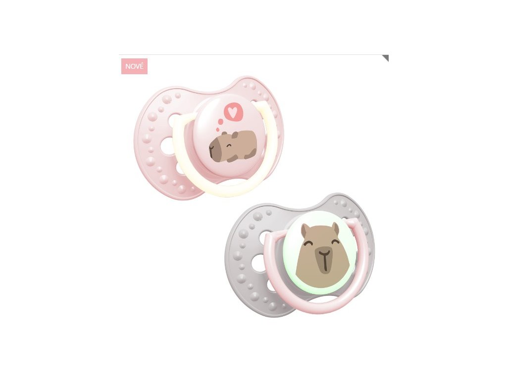 Súprava 2 ks - úchytka pri jednom cumlíku a stred pri druhom cumlíku svieti v tme.