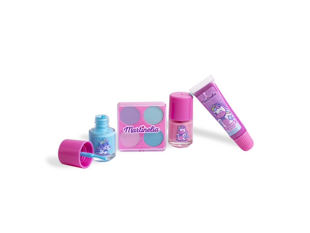 MARTINELIA Little unicorn Sada dekoratívnej kozmetiky. Obsahuje: 1x paletka očných tieňov - 4 farby, 2x lak na nechty, 1x lesk na pery. Na odstránenie laku na nechty použite teplú vodu a mydlo, potom lak ľahko zlúpnete. Šetrné pre detské nechty, nie je potrebné použiť odlakovač na nechty.Dodatočné parametre