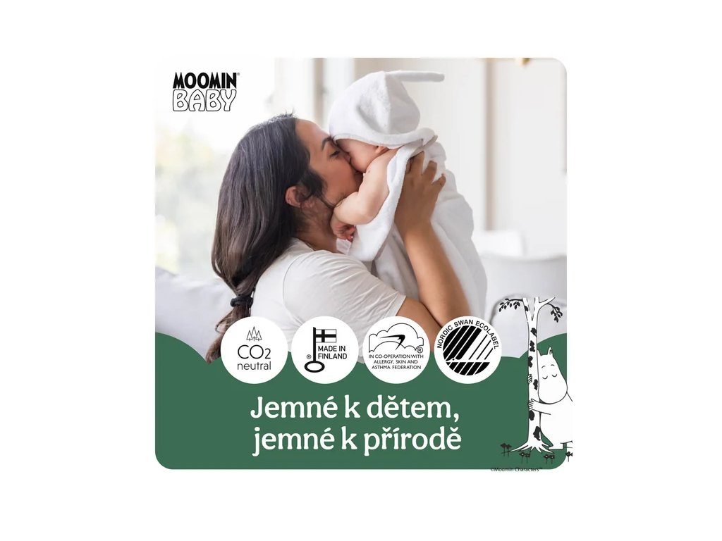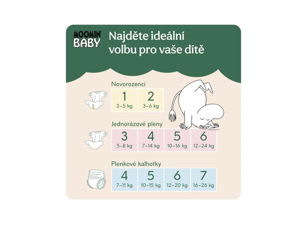 Či už máte doma malé bábätko alebo aktívne batoľa, prirodzene mu chcete dopriať tú najlepšiu starostlivosť . Detská pokožka totiž vyžaduje nielen šetrnú kozmetiku, ale predovšetkým jemnú a pohodlnú plienku . Ich s uperabsorpčné jadro efektívne odvádza vlhkosť a udržuje pokožku suchú po celý deň. Pružné a mäkké materiály sa prispôsobia pohybom vášho dieťaťa, čo zaistí úplnú spoľahlivosť aj pri zvýšenom pohybe. Roztomilé postavičky Moomin zdobia prednú stranu plienky.