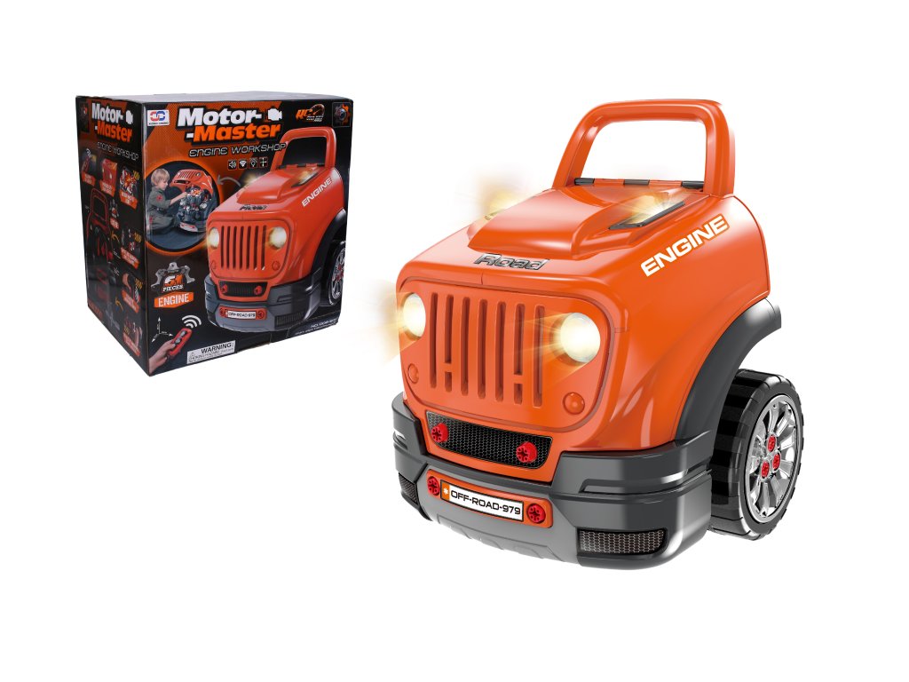 Hračka je určená všetkým zvedavým chalanom, ktorí si želajú stať sa automechanikom. Nauč sa opraviť motor terénneho auta a zisti, kde je závada. Motor má 61 súčiastok a rad funkcií. Súčasťou sú kľúče na diaľkové ovládanie (tlačidlá pre odomknutie, zamknutie, klaksón). Auto má funkčné predné svetlá, klaksón, radiacu páku, výstražné svetlo, štartovacie tlačidlo, odklápaciu kapotu, osvetlenie motora, meranie oleja. Auto vydáva zvuky motora. 3xAA pre motor nie sú súčasťou, 1xCR2055 pre kľúče súčasťou.Dodatočné parametre