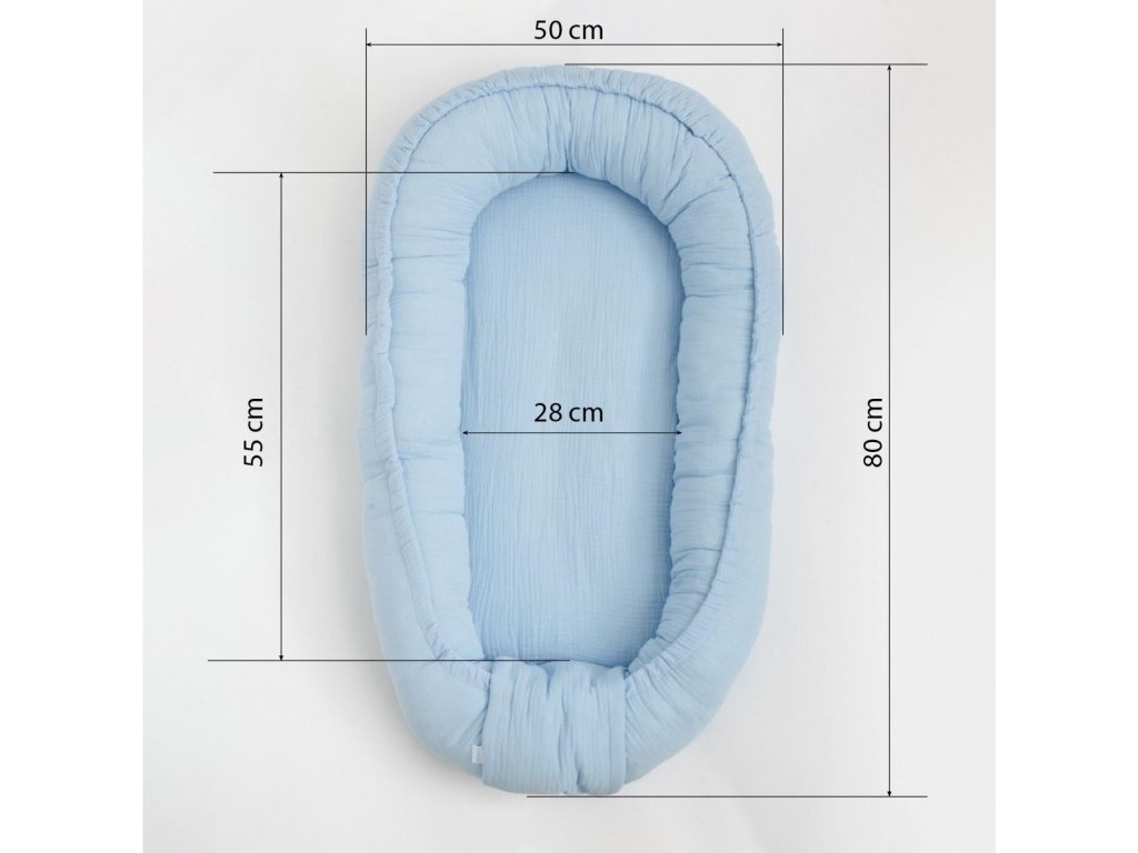 Mušelínové hniezdočko New Baby je vyrobené z prvotriednej bavlnenej priadze. Umožňuje umiestniť dieťa do pohodlnej polohy a hlavne môže byť dieťa umiestnené v kokone stále v blízkosti mamičky. Pri cestovaní si môžete vziať hniezdočko so sebou, aby dieťa pripútané k vôni domova a svojmu miestu mohlo bezstarostne spať na inom mieste. Hniezdočko môžete umiestniť do postieľky, na pohovku, na zemi aj do kočíka. Dieťa v ňom môže spať, odpočívať alebo sa hrať. Hniezdočko bude veľkým pomocníkom vo vašej domácnosti. Určené pre bábätká od 0-12 mesiacov.
