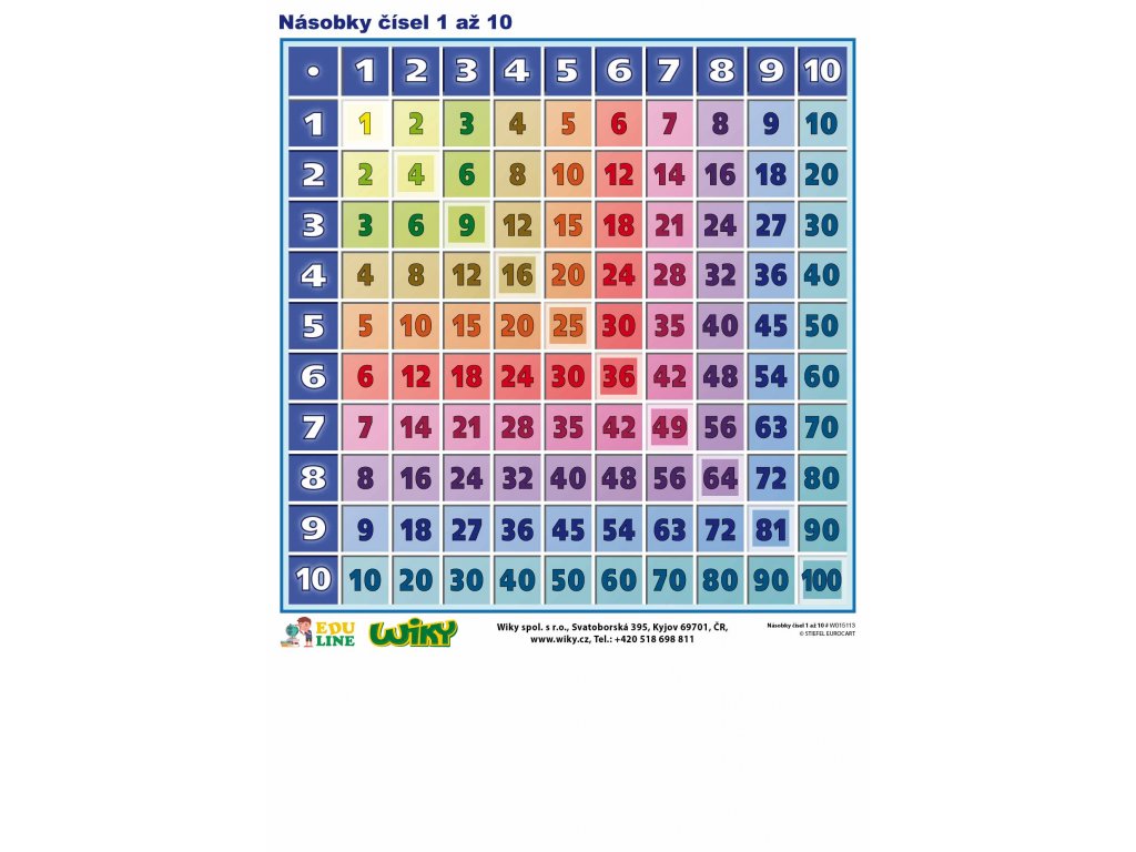 Obojstranná didaktická pomôcka s vyobrazením násobkov čísel od 1 do 10 je určená predovšetkým pre 3. a 4. ročník základnej školy. Názorné zobrazenie radov násobkov čísel pomáha žiakom pri osvojovaní násobenia a delenia prirodzených čísel v odbore násobiliek do 100. Prehľadné a farebne hravé spracovanie nástennej tabule uľahčí žiakom zautomatizovanie a zapamätanie všetkých spojov a prirodzeným spôsobom v nich prebudí záujem o násobenie a delenie. Zadná strana didaktickej pomôcky je bez výsledkov a je určená na precvičovanie a preskúšanie.Dodatočné parametre