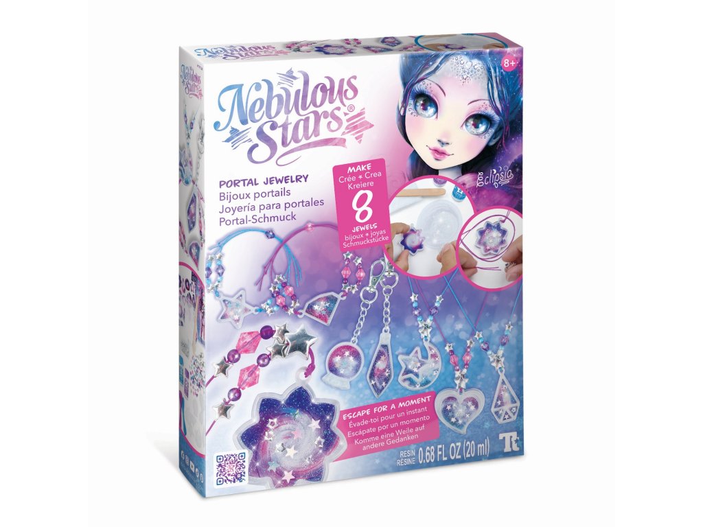 Nebulous Star Portálové šperky Eclipsia. 8 základov pre tvorbu šperku, 2x fľaštička so živicou, nálepky, flitre, trblietavý prášok, nylonové povrázky, 105 korálikov, 2x háčik, 2x zapínací krúžok, nádoba a tyčinka na miešanie živice, rukavice na jedno použitie.Dodatočné parametre