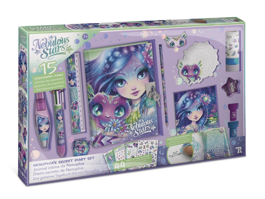 Nebulous Stars Tajný denník Nenuphia. Obsah - denník s 200 stránkami, zámok 6 farebné pero, ceruzka, strúhadlo, guma, 2 pečiatky, nálepky, aplikačné pero, pravítko, 2 klipy, magnetická záložka, notes so 150 linajkovými stránkami, 44 stránok aktivít, príbeh Nenuphia.Dodatočné parametre