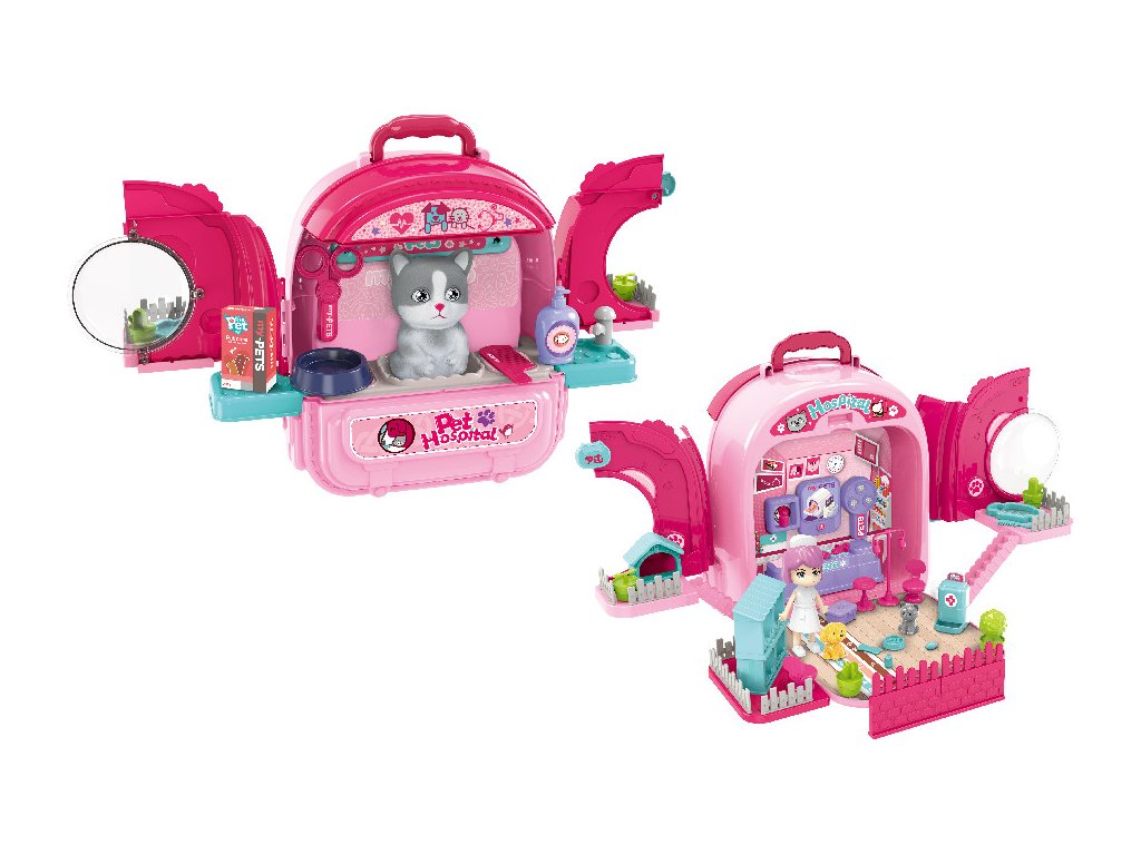 Nemocnica zvieracia v batohu mačka. Rozmery 50x35x30 cm. Veľkosť mačky 17 cm. Batoh je otvárací z dvoch strán. Balenie obsahuje zariadenie zvieracej ordinácie, figúrku mačky a príslušenstvo: misku, fľaštičky, bábiku zdravotnú sestru, drobnosti do ordinácie.Dodatočné parametre