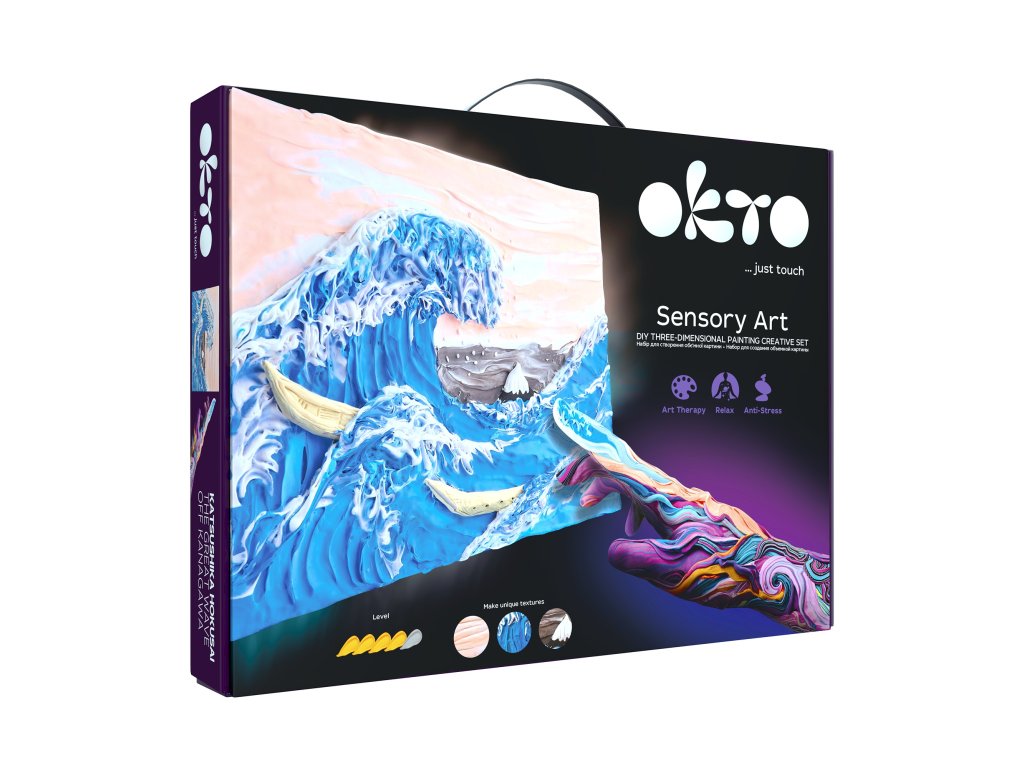 OKTO SENSOTY ART výtvarná sada ”Veľká vlna pri pobreží Kanagawy”. Veľkosť plátna 30x40cm. Obsah balenia: prírodné plátno, návod, drevený tvarovací nástroj, sada modelovacích hmôt, akrylový (vodou rozpustiteľný) lak 20 ml, štetec.Dodatočné parametre