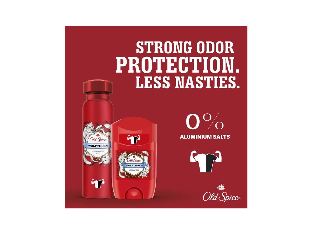 Old Spice Wolfthorn Pánsky deodorant v spreji so sviežou vôňou chráni pred potom, nepríjemným zápachom a dodáva telu pocit dlhotrvajúcej sviežosti . Dezodorant je špeciálne navrhnutý pre všetkých mužov, ktorí chcú žiť svoj život naplno bez obáv z potenia.