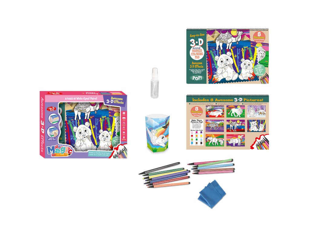 Omaľovánky s 3D očami, stierateľné. Rozmery 28x21,5x1 cm. 8 obrázkov.Dodatočné parametre