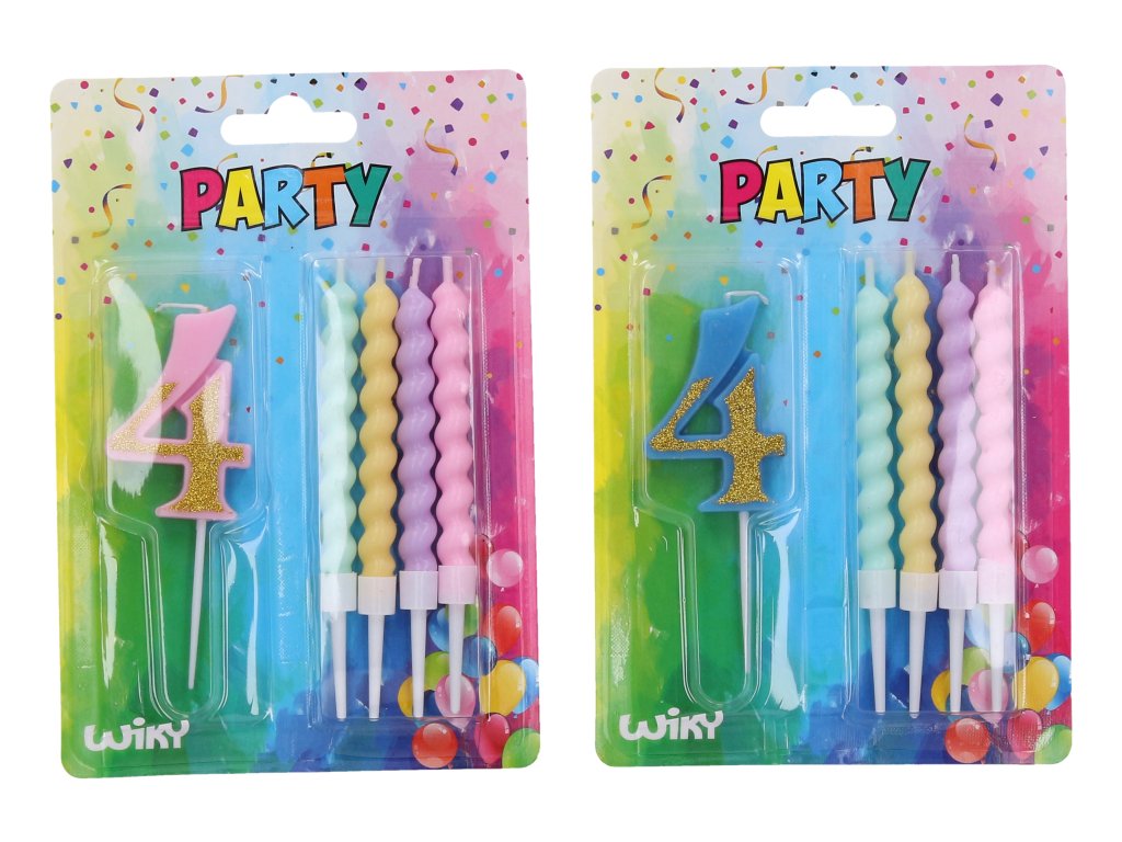 Párty sviečka číslo 4 + 4ks sviečok. 2 farebné varianty - modrá, ružováDodatočné parametre
